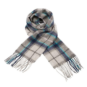 Lovely warm lambswool scarf in a classic blue, grey and teal tartan.