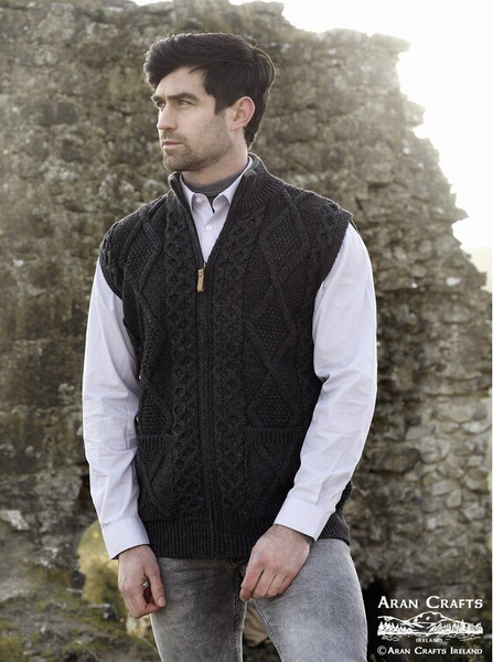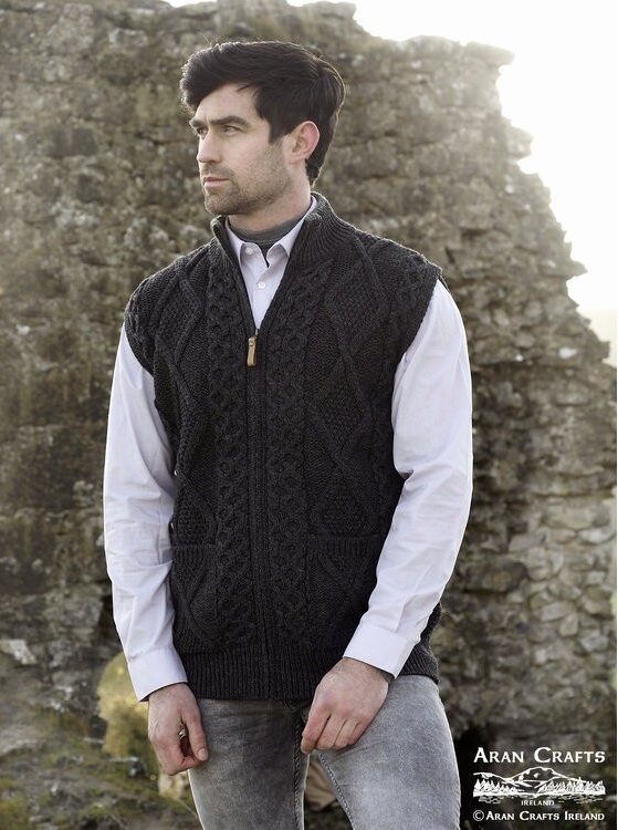 Full Zip Mens Sleeveless Aran Cardigan - Charcoal or Oatmeal