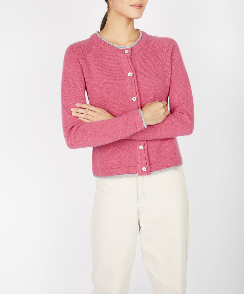 Killiney Fine Wool Cashmere Cardigan in Rose Pink with Grey Trim